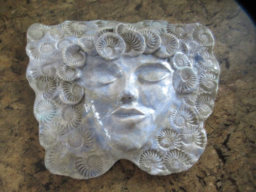 Diese Skulptur / Maske wurde von mir entworfen und von Hand in Aufbautechnik aus weißem Ton gearbeitet. Sie wurde bei zunächst 850 Grad gebrannt, dann mit